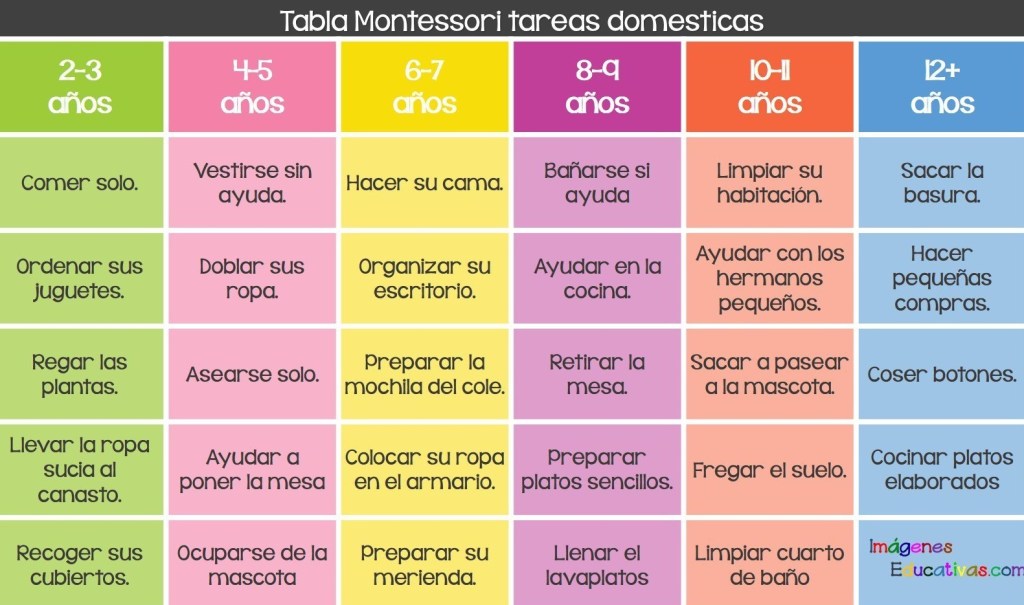 Para haceros una idea de las responsabilidades por edades, os mostramos una tabla extraída de la web: http://www.imageneseducativas.com, sobre responsabilidades que pueden tener los niños por edades según la filosofía de Montessori.